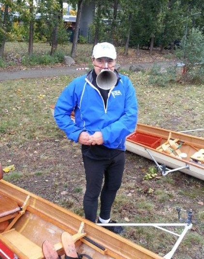 Ein Ausrüstungsteil ist allerdings im Boot geblieben. Es war die schon fast historische Aluminium-Flüstertüte, die mir Michael Schablack vom Schülerbootshaus zu treuen Händen geliehen hat. Dirk hat sie mit Argusaugen bewacht. Wieder zurück, wurde sie anprobiert und festgemacht. Natürlich riss dabei ein morsches Gummiband – die Uhr hätte man danach stellen können. Zum Glück waren Kollegen vom Berliner Ruderclub in der Nähe, die mir leicht amüsiert schmunzelnd einen roten Schnürsenkel spendierten. Der war auch lang genug, so dass auch noch eine Schleife gebunden werden konnte. Die Junghirsche um uns herum betrachteten mich wie einen Außerirdischen. Wir hatten unseren Spaß dabei und Sigurd fütterte mich durch die Tröte mit einer doppelten Portion Traubenzucker. Dafür revanchierte ich mich mit getrockneten Bananen, musste mich aber dabei auslassen, weil man nicht weit genug in den Trichter fassen konnte. Das machte nichts, denn zum Zusetzen hatte ich ja genug.
