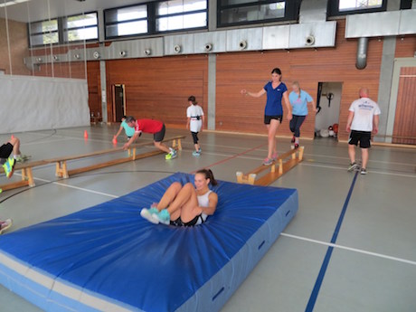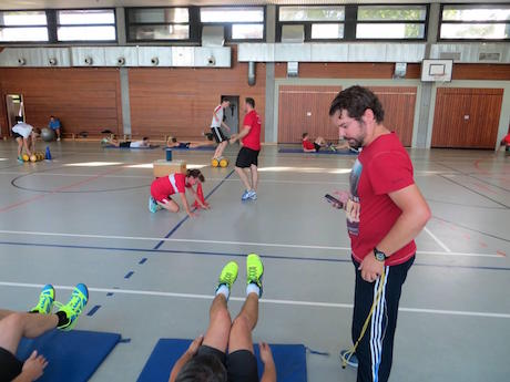 So ging die Zeit dann auch schnell rum. Gegen Ende des Lehrgangs mussten wir alle in einem selbst erarbeiteten Praxisteil und Theorieteil zeigen was wir in den zwei Wochen gelernt haben. Dies waren Gruppenarbeiten, so dass Teamwork und gute Organisation gefragt waren. Es wurde eine komplette Sportstunde für die Turnhalle professionell vorbereitet und durchgeführt. Im Anschluss gab es Feedback durch die Teilnehmer und von Andreas. Im Theorieteil ging es darum gelerntes wieder ins Gedächtnis zu holen und zu zeigen, dass man das referierte tatsächlich verstanden hat. Unsere Gruppe entschied sich dafür, die uns übertragenen Themengebiete mittels einer gemeinsam erarbeiten Power Point Präsentation den Teilnehmern noch einmal komprimiert vorzustellen. Auch hier gab es selbstverständlich Feedback durch Andreas.