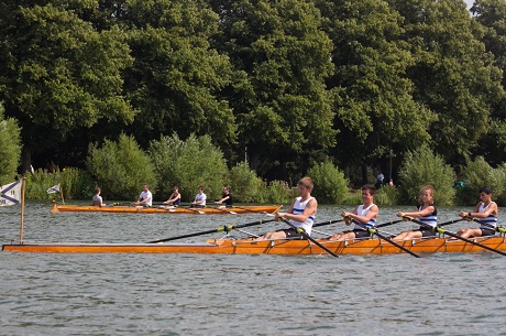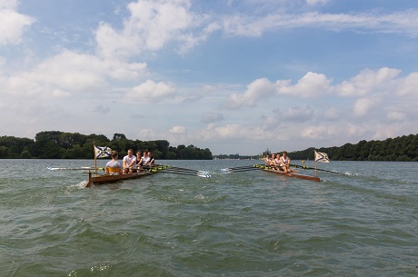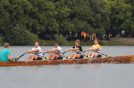 Im anschließenden KIK-Vierer-Rennen wurden die Regeln selbst noch kurz vor dem Start ausdiskutiert, wobei jedes Boot dann letztlich seine eigene Interpretation fuhr. So konnte sich der schon vorab als Sieger angepriesene Riemen-Vierer nicht gegen die schluckstarke Jugend und die Teamkollegen der RBL durchsetzen. Dafür waren sie dann aber die Ersten wieder am Steg. Die Leistungssportler hatten ihre Prioritäten dann eher aufs Rudern gesetzt als auf das zügige entleeren des kohlesäurehaltigen isotonischen Kaltgetränks. Aber egal, der Spaß stand an erster Stelle!