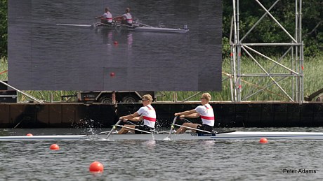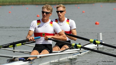 Am Start waren es aber zunächst das österreichische Brüderpaar, das sich an die Spitze des Feldes setzte. Ihnen auf den Fersen folgte der deutsche Zweier dicht gefolgt von Spanien. Mit einer Länge Rückstand ging es über die 500m Marke. Auch auf dem darauf folgenden Streckenabschnitt führten die Österreicher ein kleines Stück weiter vom deutschen Duett weg, das sich seinerseits leicht von den Spaniern lösen konnte. Mit etwas Abstand folgten die Boote aus Polen, USA und Griechenland. Ein Spurt folgte dem anderen, man wollte sich auf keinen Fall geschlagen geben, aber die Geschwister Sieber fuhren den Verfolgern wie beflügelt immer weiter davon. Einzig unsere Jungs schienen da noch einigermaßen mithalten zu können, dahinter lag das Feld weiter sehr dicht zusammen, nun mit leichten Vorteilen für Polen, abgeschlagen die Mannschaft aus Griechenland.