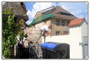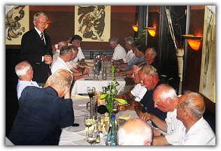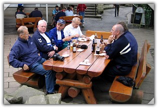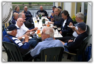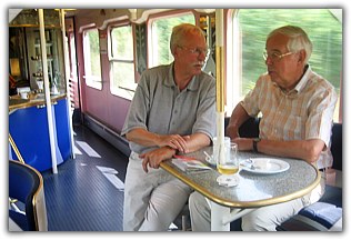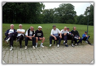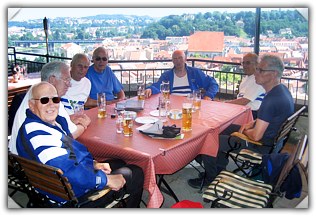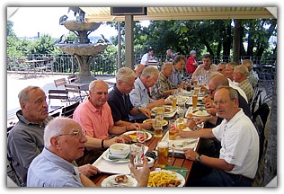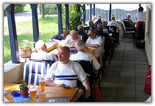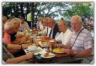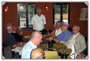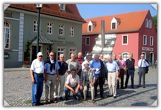 Sonntag, 3. Juni - Anreise. Die Anreise erfolgte mit IC, ICE und Regionalexpress. Dort wurde erstmals das Lied "Verzeihen Sie, ist dies der Zug nach Kötzschenbroda?" angestimmt. Als man in Radebeul-West eintraf, waren die Autofahrer auch schon dort, und so konnten Adolf Bolte, Gustav Breinker, Peter Brieger, Rainer Denecke, Hans Albert Dingel, Uli Fröhlich, Jürgen Gerking, Georg Hübner, Wolfgang Klimas, Günter Lehr, Günter Noltemeyer, Claus C. Nommensen, Hansjürgen Scheele, Wolfgang Techtmann, Jürgen Thoms, Rolf Uebel, und Rolf Walter ihre Zimmer im Hotel Goldener Anker in Radebeul-Kötzschenbroda beziehen. Eine Gemütlichkeit ausstrahlende Gaststätte liegt dort neben der anderen. Wir trafen uns bei Stumpfs Hof aßen, tranken und diskutierten die Planung des nächsten Tages. Peter Brieger übernahm es, die Bootsbesatzungen und die Obleute zu bestimmen. Jeder sollte einmal im Vierer fahren.