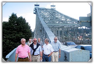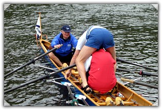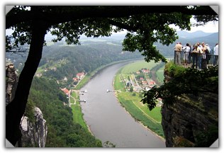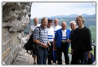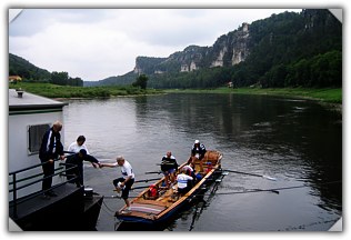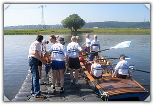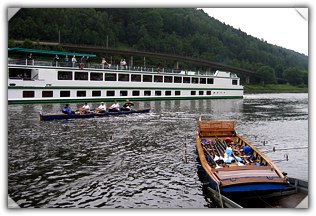 Montag - Bad Schandau (km 10,2), Bastei und Pirnaer RV (km 34,4). Mit dem RE fuhr man nach Bad Schandau, während der Landdienst mit Rolf Walter und dessen Geländewagen die Boote, eine Barke und ein Doppelvierer, beim Dresdner RV abholte. Man rätselte, wie die Barke bei dem niedrigen Wasserstand über zahlreiche Steine wohl zu Wasser gelassen werden könnte. Das ging dann doch problemlos und bald passierte man Königstein und sah voraus die Bastei. In Rathen gab es unterschiedliche Vorstellungen über die Anlegemöglichkeit. Claus C. Nommensen ließ kurzerhand an einem Ponton anlegen, über den man auf abenteuerliche Weise an Land gelangen konnte. Einige faulenzten bei Kaffee und Kuchen im Ort, die meisten erklommen die 194 Höhenmeter zur Bastei, die einen herrlichen Ausblick auf die Elbe gewährt. Die Fahrt ging weiter zum Pirnaer RV in dessen Treppenhaus die Hochwassermarke des Jahres 2002 für Aufsehen sorgte. Mit dem RE ging es nach Radebeul zurück und am Abend in das Dampfschiff, einer am Elbufer gelegenen Gaststätte mit jahrhunderte alter Tradition. Das Rudern in der Barke wurde einstimmig gelobt. Allerdings benötigte die Barke für 1 km 108 Ruderschläge, während im Vierer nur 64 Schläge gezählt wurden. Auf dem Maschsee hatten wir vor einiger Zeit einmal im Doppelvierer genau 100 Schläge für 1 km benötigt.