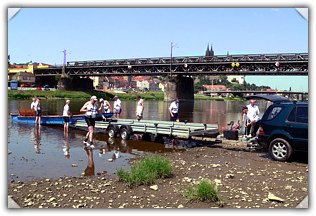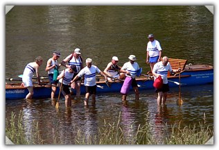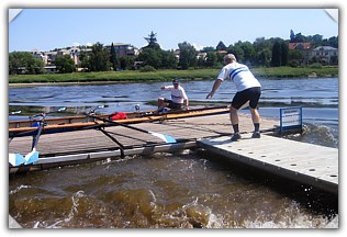 Freitag - Radebeuler RV (km 68,2), Meißen (km 81,8) Bei 30 Grad und wolkenlosem Himmel ruderten wir am letzten Tag nur noch 13,6 km bis Meißen. Man fand vor der Eisenbahnbrücke einen Platz zum Verladen der Barke. Allerdings musste man im Wasser aussteigen und das Boot vorsichtig über die Steine ziehen. Ein Mitglied des dortigen Kanuvereins bewunderte Rolf Walters Fähigkeit, mit Hänger rückwärts bis in das Wasser zu fahren. Nachdem die Boote gereinigt und verladen waren, ging es zu Fuß hinauf auf den Schlossberg mit seiner herrlichen Sicht auf die Stadt. Am Abend gab es im Hotel ein gutes Abschlussessen. Hans-Albert Dingel bedankte sich bei Reinhard Knieriemen für die gute Organisation, und Rolf Uebel übergab Reinhard einen Blumenstrauß für seine Ehefrau. Alle waren sich einig, dass man sehr schöne Tage mit unerwartet gutem Wetter verlebt hatte.