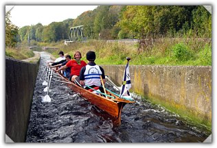 Unser Quartier wechselten wir am Montag und zogen in die heiligen (Boots-)Hallen des TVK Essen. Am Vormittag ruderten wir eine längere Etappe auf der Ruhr, die an vielen alten Industriedenkmälern vorbei führte, überquerten den Baldeneysee und rutschten eine weitere Bootsrutsche hinunter. Nachmittags fuhren wir nach Gelsenkirchen in ein mit eiserner Faust geführtes Spaßbad. Aufgrund des strengen Regimentes wurden unsere redlichen Bemühungen, den Spaß im Spaßbad etwas mehr zu betonen, zwar von den Gästen, nicht jedoch vom Personal zu würdigen gewusst, so dass wir etwa 90 Minuten später wieder auf der Straße standen. Das "Schwimmen der Anderen" gehörte dennoch zu den besten Aktionen und hat trotz allem sehr viel Spaß gemacht.