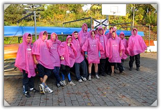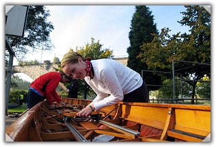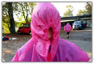 Dienstag mussten wir die Boote mit dem Bulli um eine Schleuse herumfahren, bevor wir an einem streichholzgroßen Steg ablegen konnten. Nach dem Mittagessen ruderten wir unsere letzten Etappe bis zur Mülheimer RG, um dort die Boote zu verladen. Am Clubhaus wartete noch eine besondere Überraschung auf uns: 15 pinkfarbene Regencapes von T-Com - für jeden eins. Mit diesen ausgerüstet fuhren wir gleich nach Mülheim, um dort in dem nächsten E-Plus-Shop für die Eröffnung einer Telekom-Filliale zu werben. Leider waren die Angestellten wenig kooperativ, woll?