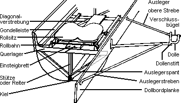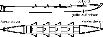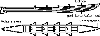 A-Gig: geklinkert (einzelnen zusammengenietete Mahagoni- oder Zedern-Planken), ziemlich breit (4er ca. 1m), relativ kurze Ausleger, älteste Bauform