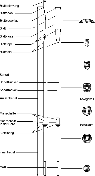 Die Bezeichnung Ruder ist der Sammelbegriff für Skulls und Riemen. Beim Skullen hält der Ruderer in jeder Hand ein Ruder, wohingegen ein längerer Riemen in beiden Händen gehalten und einseitig ins Wasser getaucht wird. Ruder werden mit einem Hohlschaft gebaut, da während des Schlages das Ruder am Schaftrücken auf Druck, am Schaftbauch auf Zug belastet wird. Dadurch entstehen im Zentrum des Schaftes keine Beanspruchungen. Traditionell wurden Skulls und Riemen aus Holz gefertigt, welches am Rücken des Ruders durch Aufkleben einer Eschenleiste verstärkt wird. Auf dieser Leiste wird dann der sogenannte Anlagekeil mit einer Neigung von vier Grad angebracht.